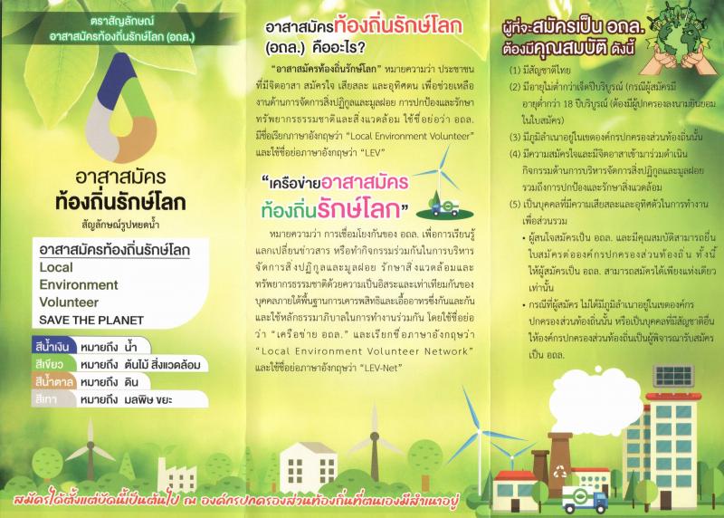 description อาสาสมัครท้องถิ่นรักษ์โลกหรือ อถล.เป็นการรวมกลุ่มของประชาชนในท้องถิ่นที่มีจิตอาสาในการช่วยเหลืองานขององค์กรปกครองส่วนท้องถิ่นเกี่ยวกับการจัดการสิ่งปฏิกูลและมูลฝอย การปกป้องและรักษาทรัพยากรธรรมชาติและสิ่งแวดล้อม มีบทบาทหน้าที่ คือ ประพฤติตนเป็นแบบอย่างในการจัดการสิ่งปฏิกูลและมูลฝอย การปกป้องและรักษาสิ่งแวดล้อม เฝ้าระวัง สอดส่อง ดูแล รางานสถานการณ์การบริหารจัดการสิ่งปฏิกูลและมูลฝอยการปกป้องและรักษาสิ่งแวดล้อมในพื้นที่อปท. สื่อสาร เผยแพร่ ประชาสัมพันธ์ ข้อมูลข่าวสารและกิจกรรมเพื่อสร้างจิตสำนึกด้านการบริหารจัดการสิ่งปฏิกูลและมูลฝอยการปกป้องและรักษาสิ่งแวดล้อม เข้าร่วมกิจกรรมเกี่ยวกับการบริหารจัดการสิ่งปฏิกูลและมูลฝอยการปกป้องและรักษาสิ่งแวดล้อมที่อปท.จัดขึ้น ให้ความร่วมมือกับอปท.ส่วนราชการภาคเอกชนและเครือข่ายอถล.เพื่อดำเนินการเกี่ยวกับการบริหารจัดการสิ่งปฏิกูลและมูลฝอยการปกป้องและรักษาสิ่งแวดล้อม ตราสัญลักษณ์อาสาสมัครท้องถิ่นรักษ์โลก สัญลักษณ์รูปหยดน้ำ สีน้ำเงิน หมายถึง น้ำ สีเขียว หมายถึง ต้นไม้ สิ่งแวดล้อม สีน้ำตาล หมานถึง ดิน สีเทา หมายถึง มลพิษ ขยะ person admin